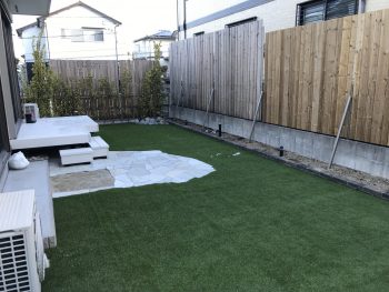 ③雑草シートに人工芝を敷く
